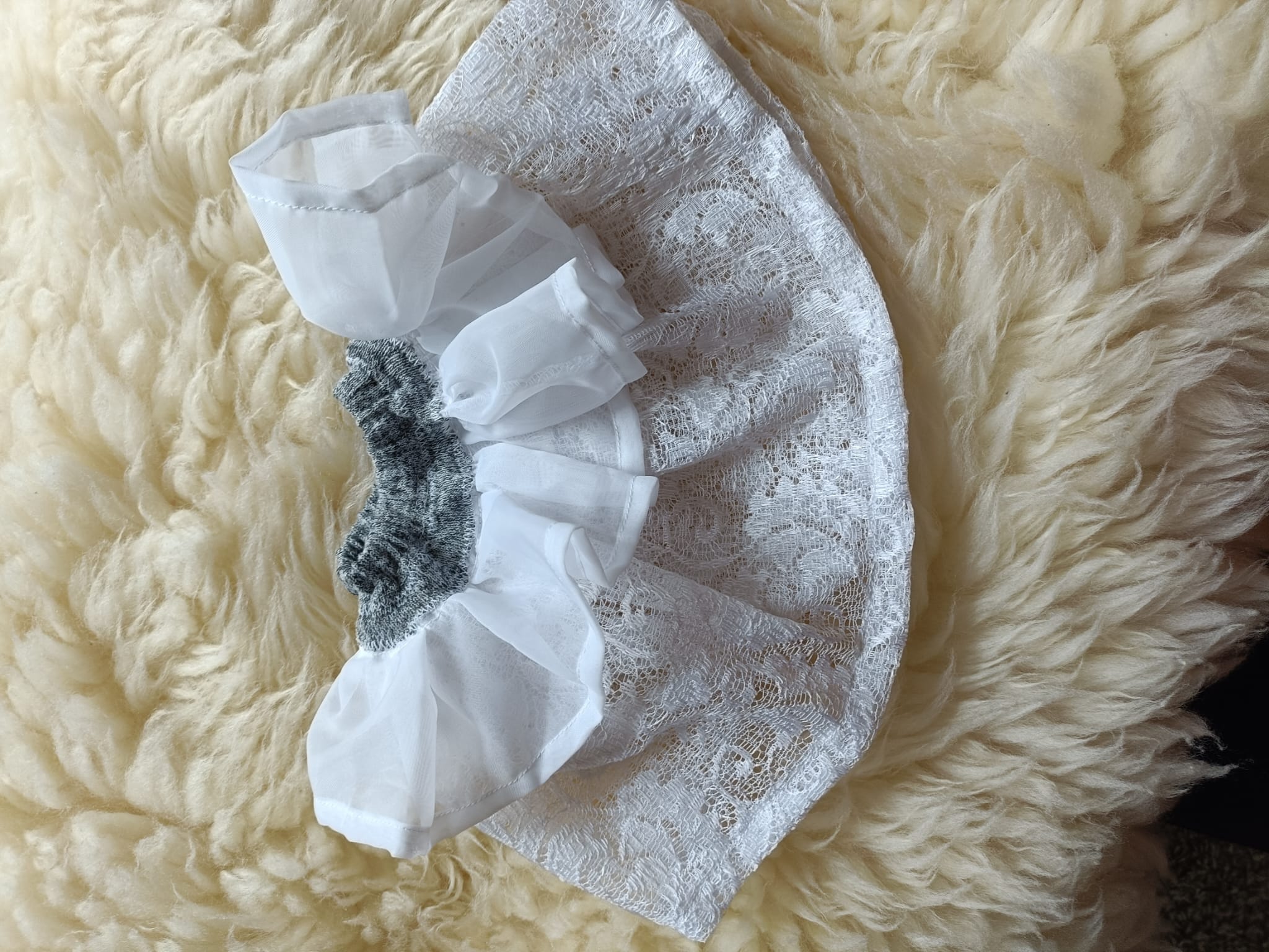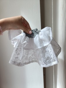 Koronkowa biała spódniczka z szarym paskiem z gumką. Pasuje na każdą tuliczkę.